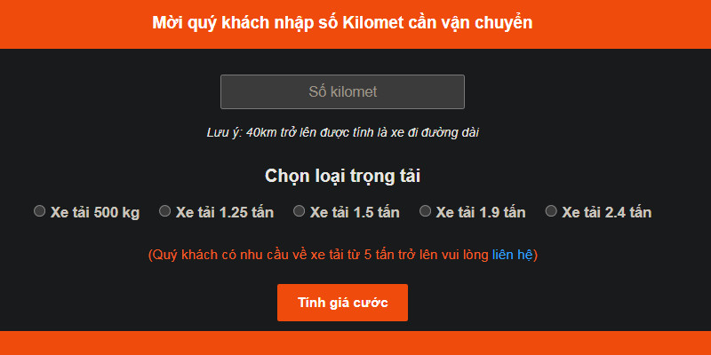 Tại đây, khách hàng chỉ cần nhập số kilomet vận chuyển và lựa chọn loại xe tải phù hợp, hệ thống sẽ tự động tính toán và hiển thị mức giá cước tương ứng.